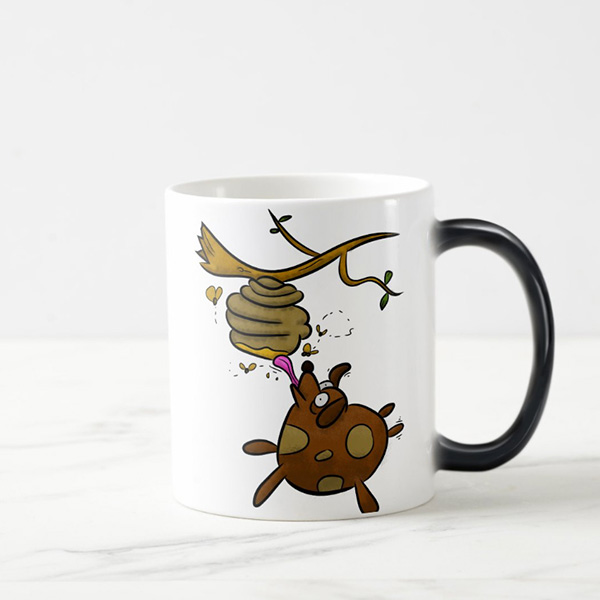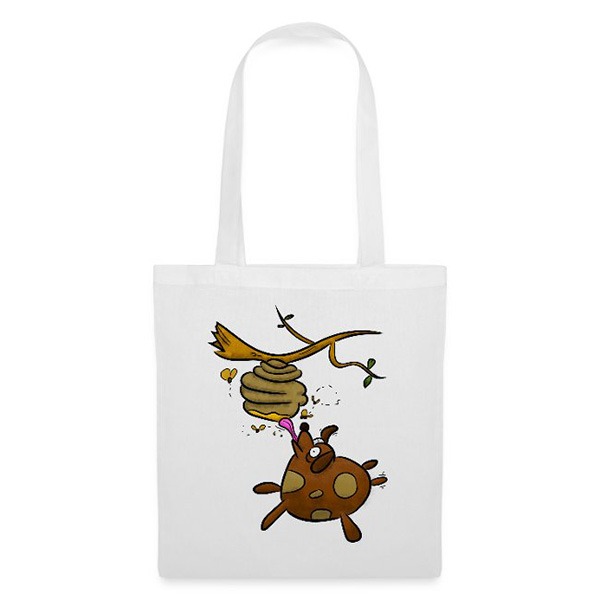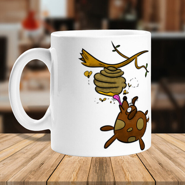 Dibujo gracioso de un perro que se hincha a chupar miel de un panal. Para niño/as y/o para goloso/as.
